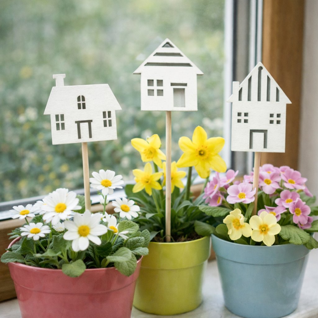 Dřevěné domečky na zápichu v různých variantách. Krásná ozdoba do truhlíků a květináčů nebo do vánoční výzdoby zimních dekorací. Široké využití dle ročního období.