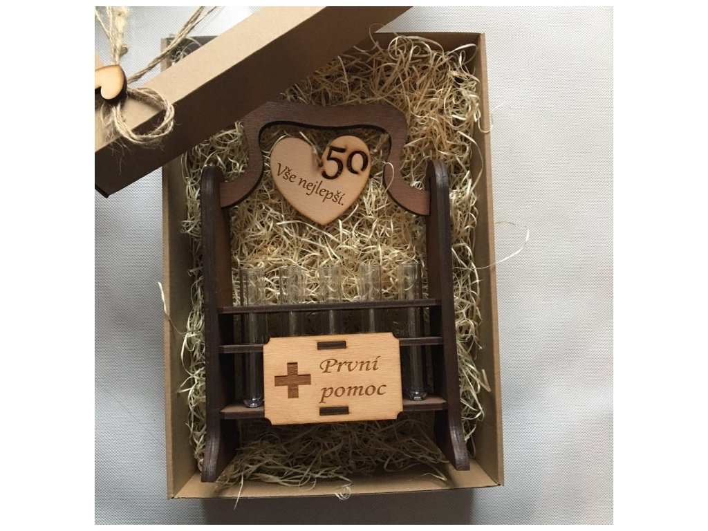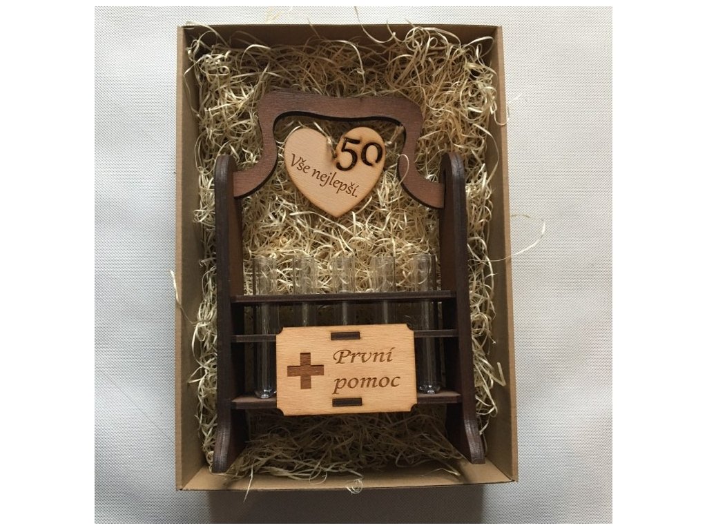 Dárková krabička pro oslavence - stylový stojánek na panáky včetně zkumavek a jubilea.