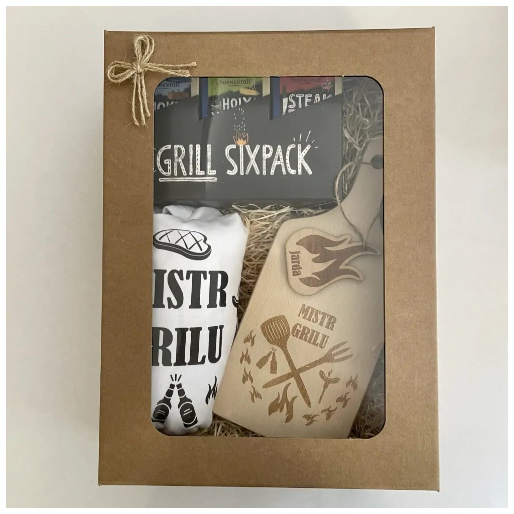 Dárkově zabalené tričko Mistr grilu, dřevěné prkénko s gravírovaným obrázkem, doplněno o jméno mistra grilu (uveďte do poznámky k produktu) a sada 6 ks výborného koření Sonnetor BIO, které se hodí ke grilování.