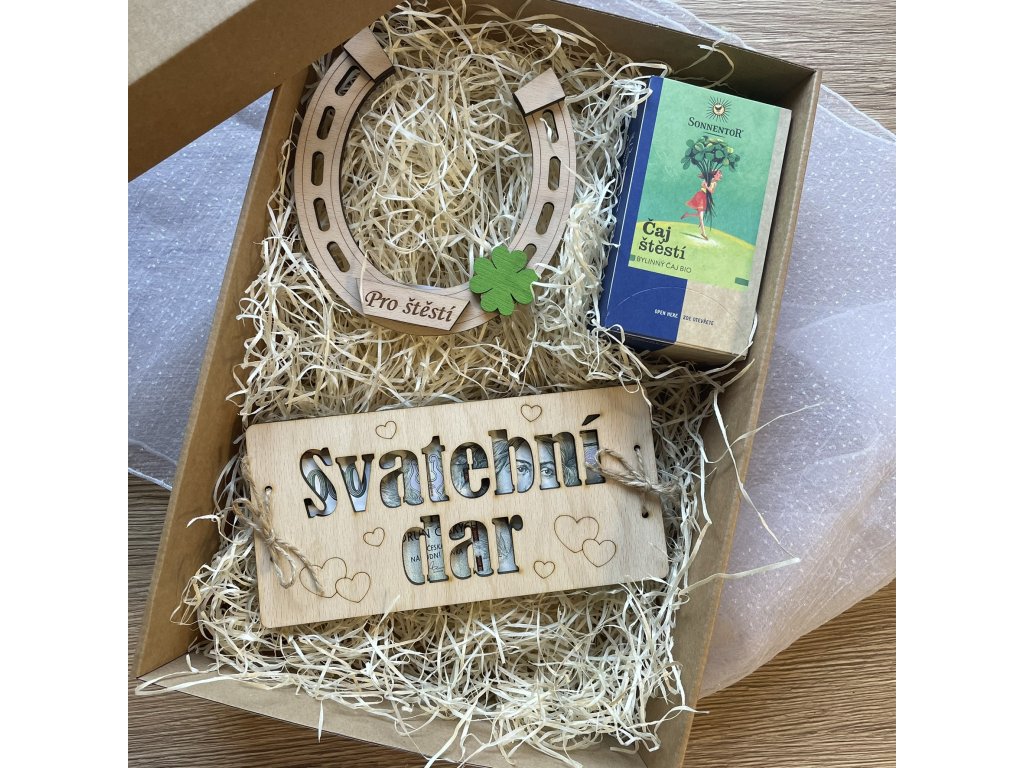 Udělejte radost novomanželům originálním balíčkem s vtipným svatebním přáním milion korun, s výborným čajem Sonnentor a podkovou pro štěstí. Vše zabaleno dárkově v papírové krabičce a průhledným víkem.