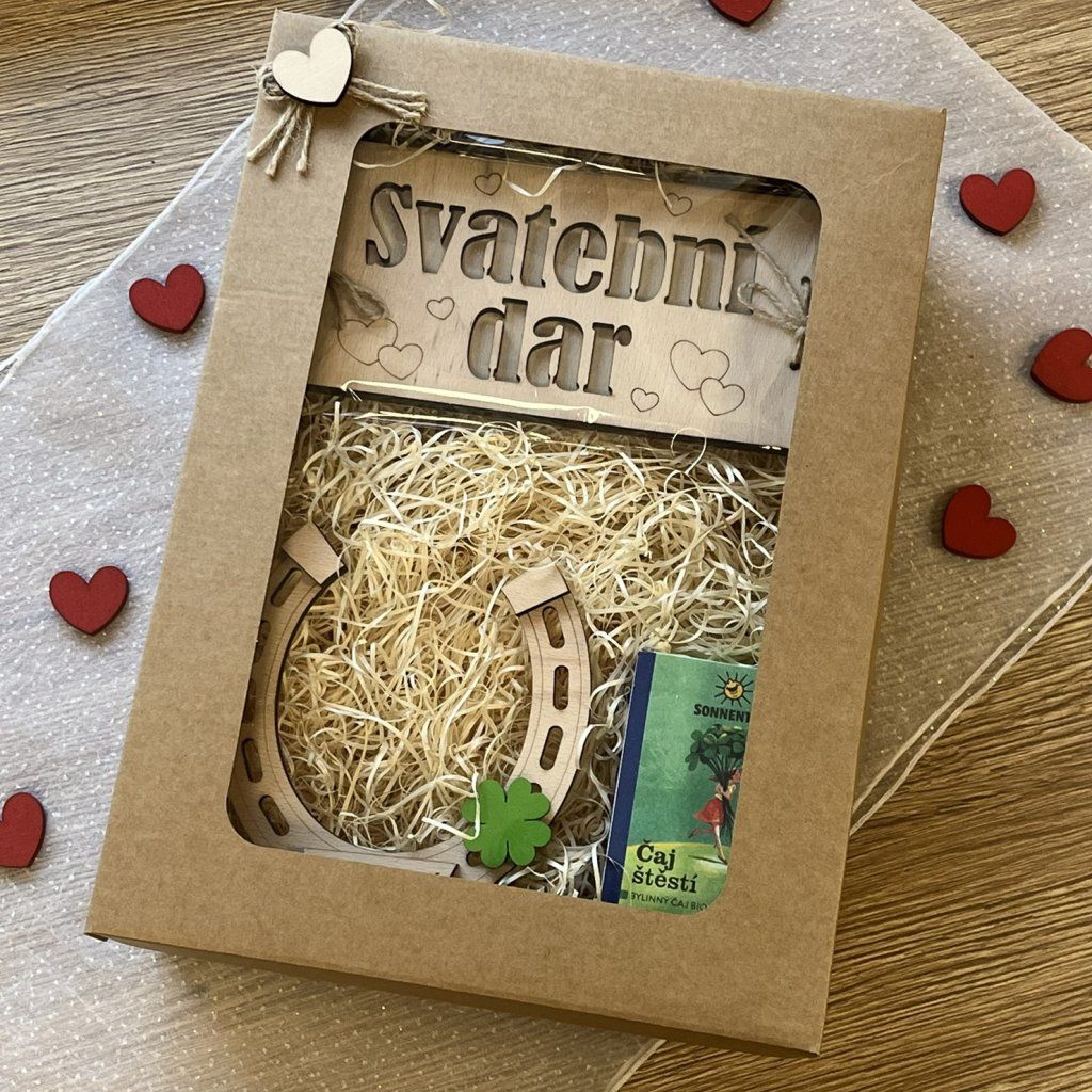 Udělejte radost novomanželům originálním balíčkem s dřevěným svatebním přáním na peníze, s výborným čajem Sonnentor a podkovou pro štěstí. Vše zabaleno dárkově v papírové krabičce a průhledným víkem.