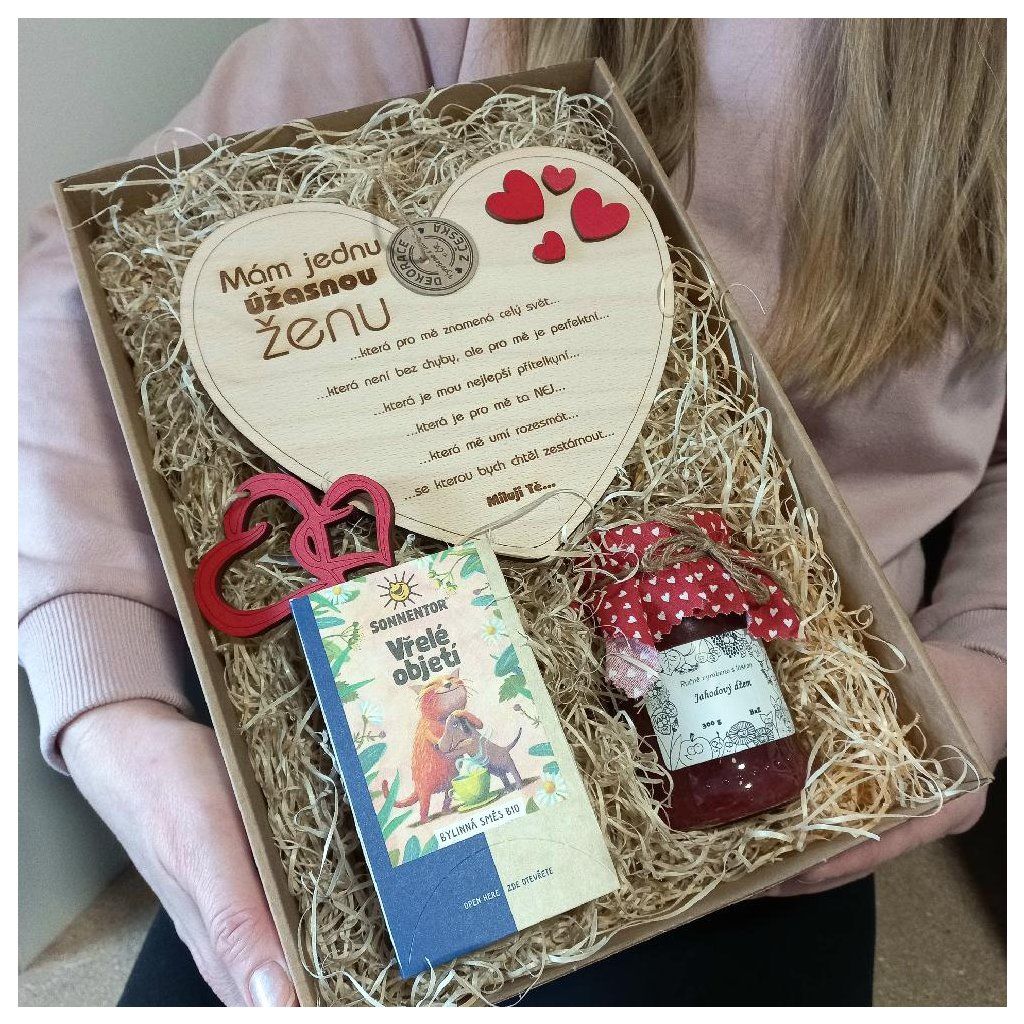 Dárková sada pro úžasnou ženu "Pohlazení pro duši" je víc než jen dárek. Je to chvilka klidu, radosti a péče, kterou si zaslouží. Voňavý čaj, sladké potěšení a dřevěné srdce s milým vzkazem ji zahřeje u srdce. Udělejte radost své lásce balíčkem s vyznáním na dřevěném srdci a dobrotami, které ji zpříjemní relaxační chvilku.