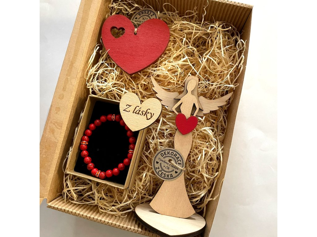 Udělejte radost své lásce dárkovou sadou obsahující dřevěné dekorace a náramek z minerálů.
