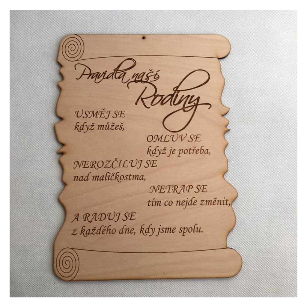 Dřevěná cedulka s gravírovaným nápisem a textem Pravidla naší rodiny o rozměru 38 cm.