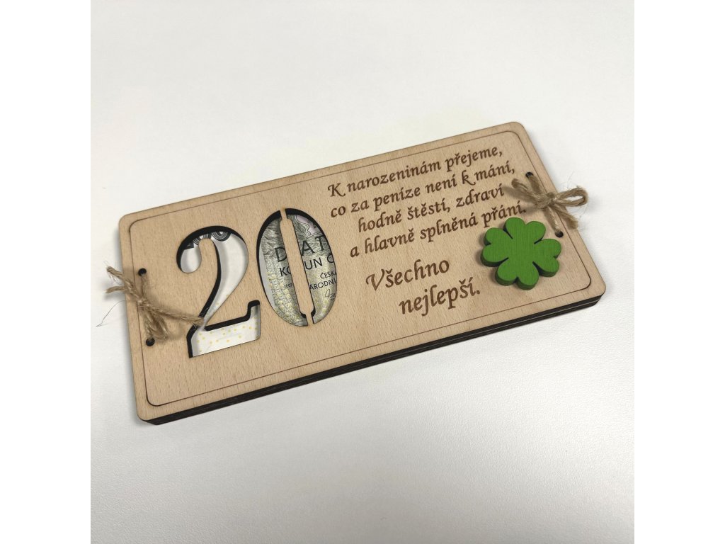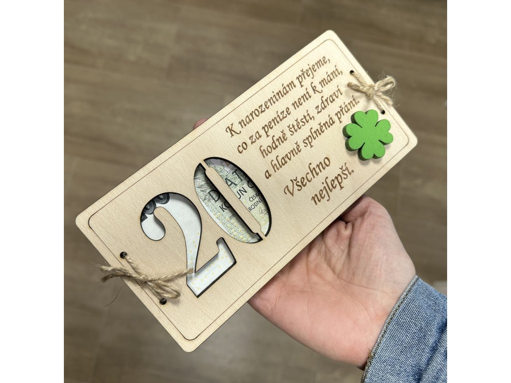 Dřevěné přání na peníze je ideální originální dárek k narozeninám či jubileu – vyberte variantu (18 – 80 let nebo univerzální) a vložte do něj bankovky či poukaz. Ke každému výročí můžete zvolit jedinečný formát, který překvapí a udělá radost.
