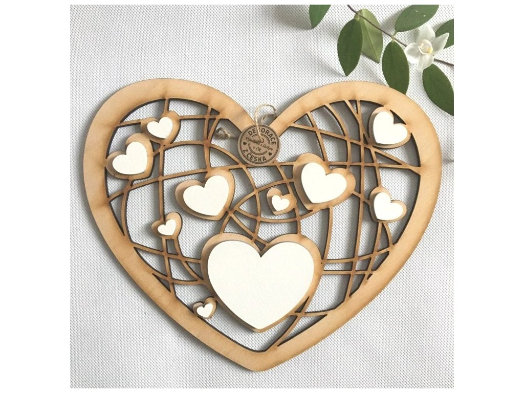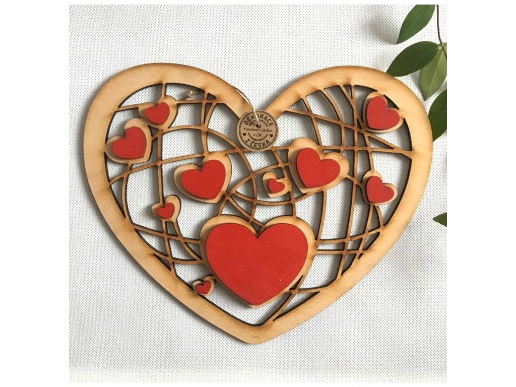 Velké dřevěné srdce s vyřezanými motivy, zdobené barevnými srdíčky.