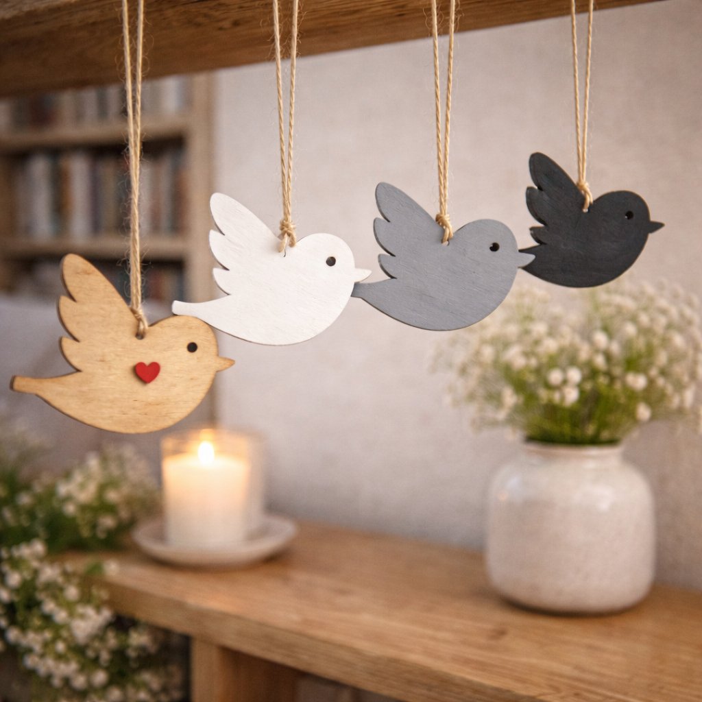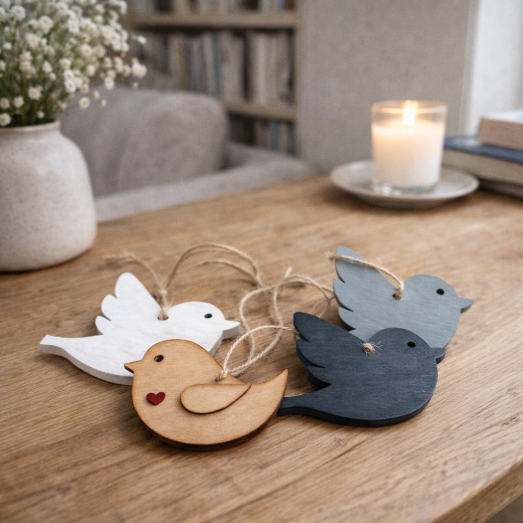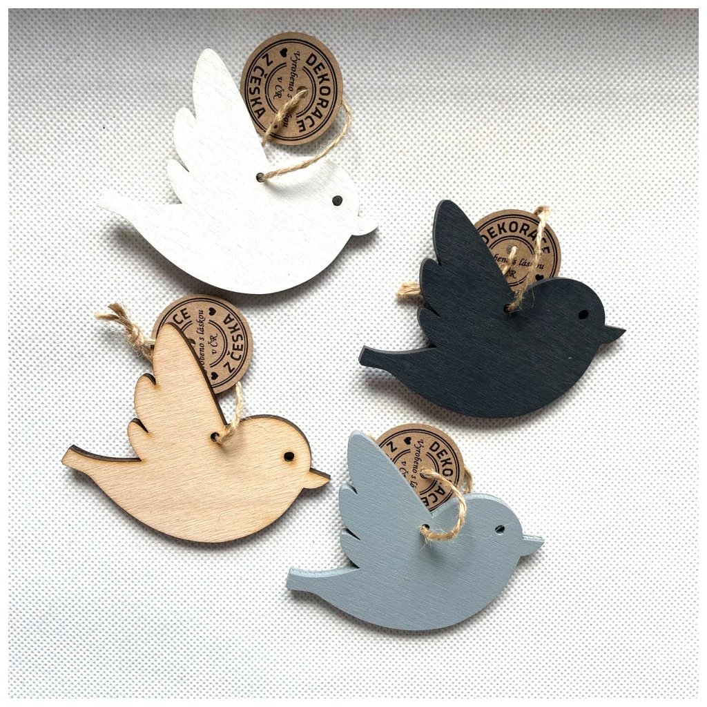 Dřevěný ptáček na zavěšení, 4 barevné varianty jako stylová dekorace do interiéru či výzdoba Vašeho domova po celý rok.