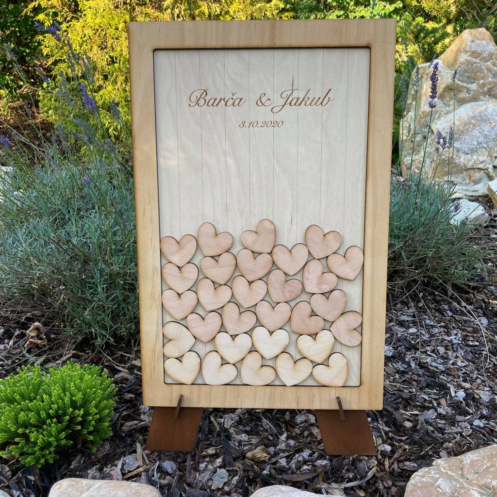 Hosté Vám podepíší srdíčka a ty se pak vloží/nalepí do dřevěného rámu, kde jsou vygravírovaná vaše jména a datum svatby. Rám lze zavěsit na zeď.