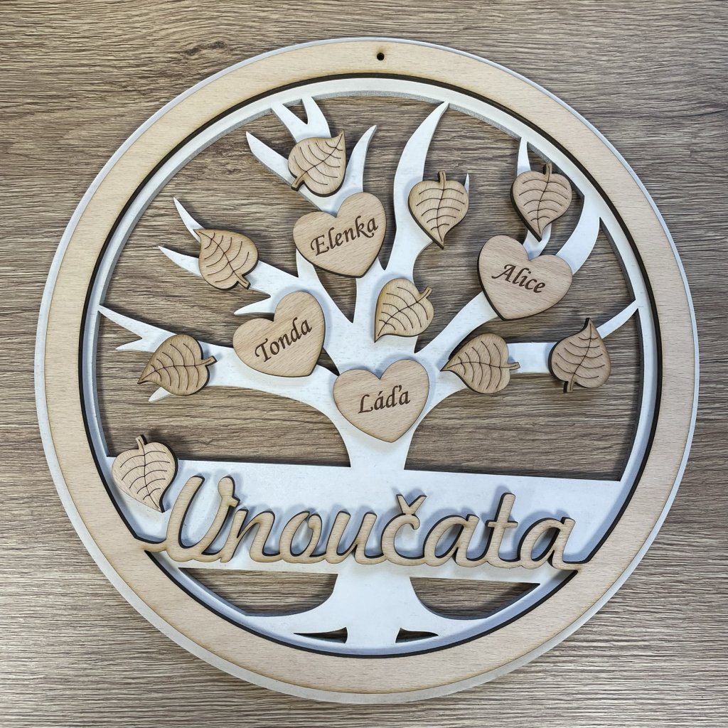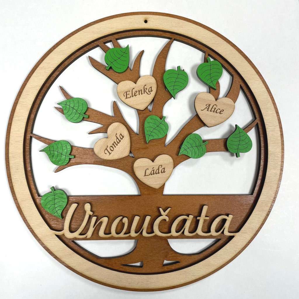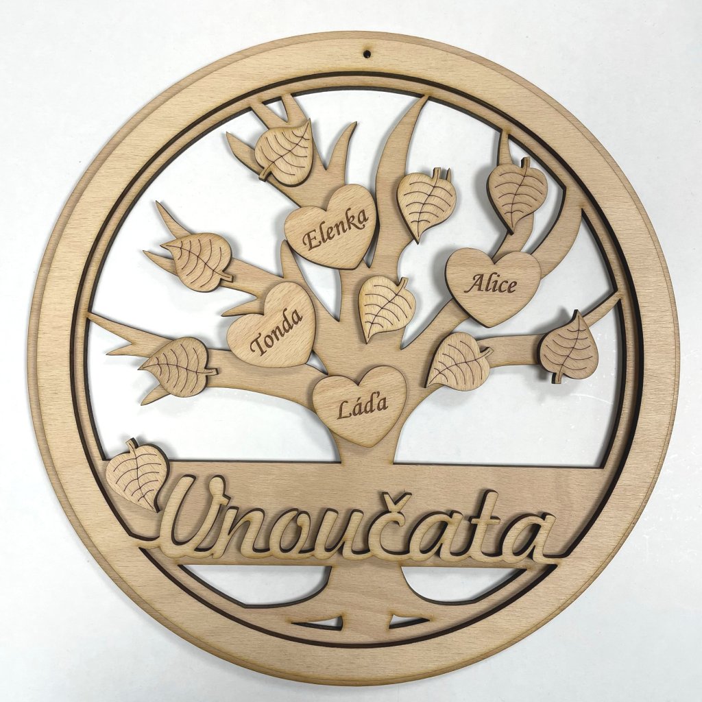 Dřevěný strom VNOUČATA na zavěšení jako krásný originální dárek. Strom je lepený ze 2 částí, jsou na něm nalepeny lístky a srdíčka se jmény vnoučat. Možnost vlastních jmen, personalizace.