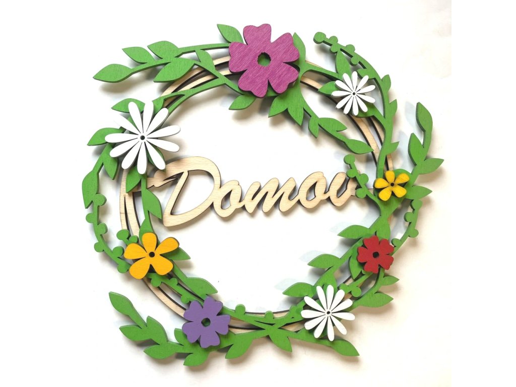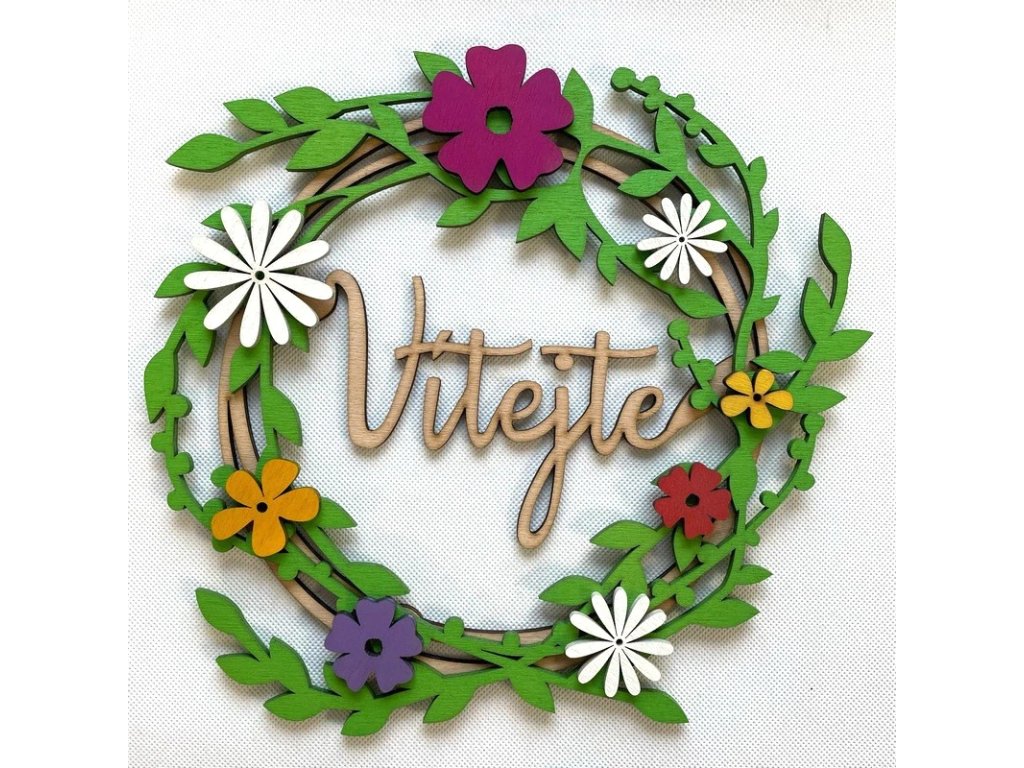 Vrstvený dřevěný věnec s vyřezávaným nápisem Vítejte, Domov nebo bez nápisu. Nápis si lze zvolit v roletce nabídky.