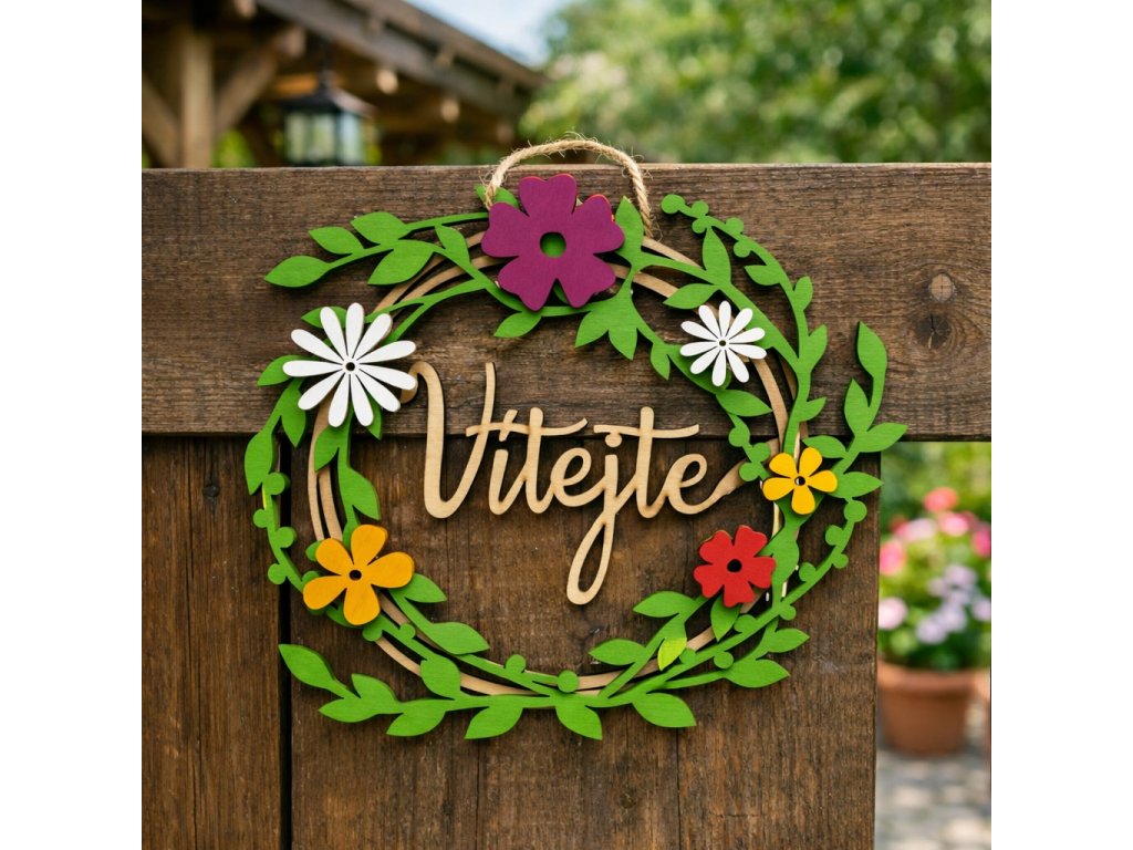 Ozdobte svůj domov krásným dřevěným věncem s vyřezávaným nápisem Vítejte, Domov nebo bez nápisu.