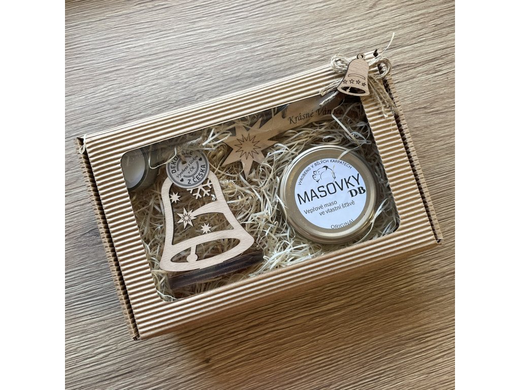 Malá vánoční dárková sada s mňamózní masovkkou, svícnem na čajovou svíčkou a dekorací
