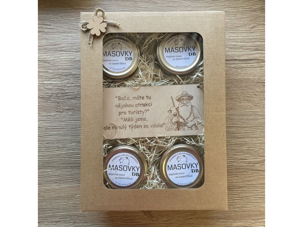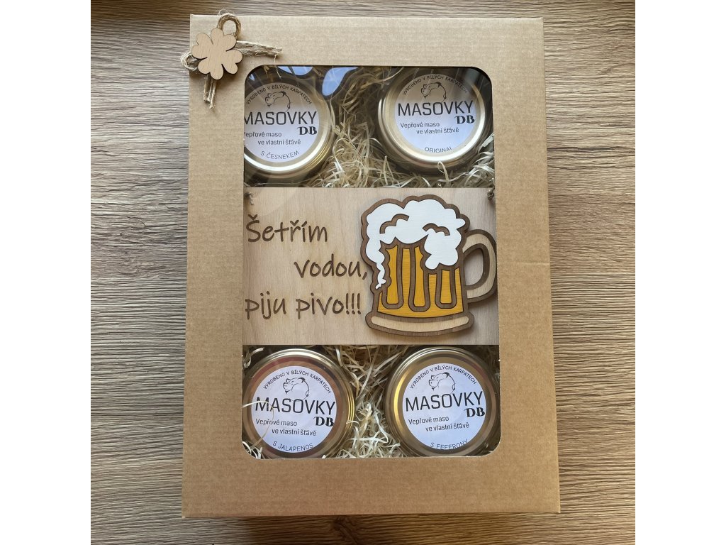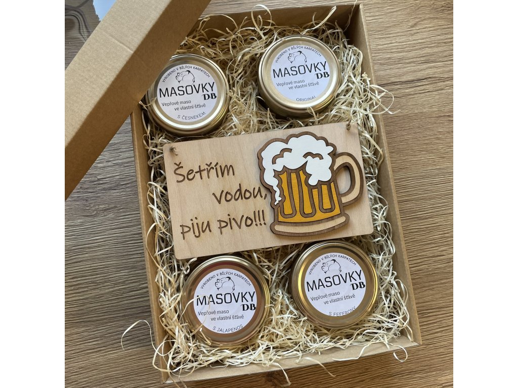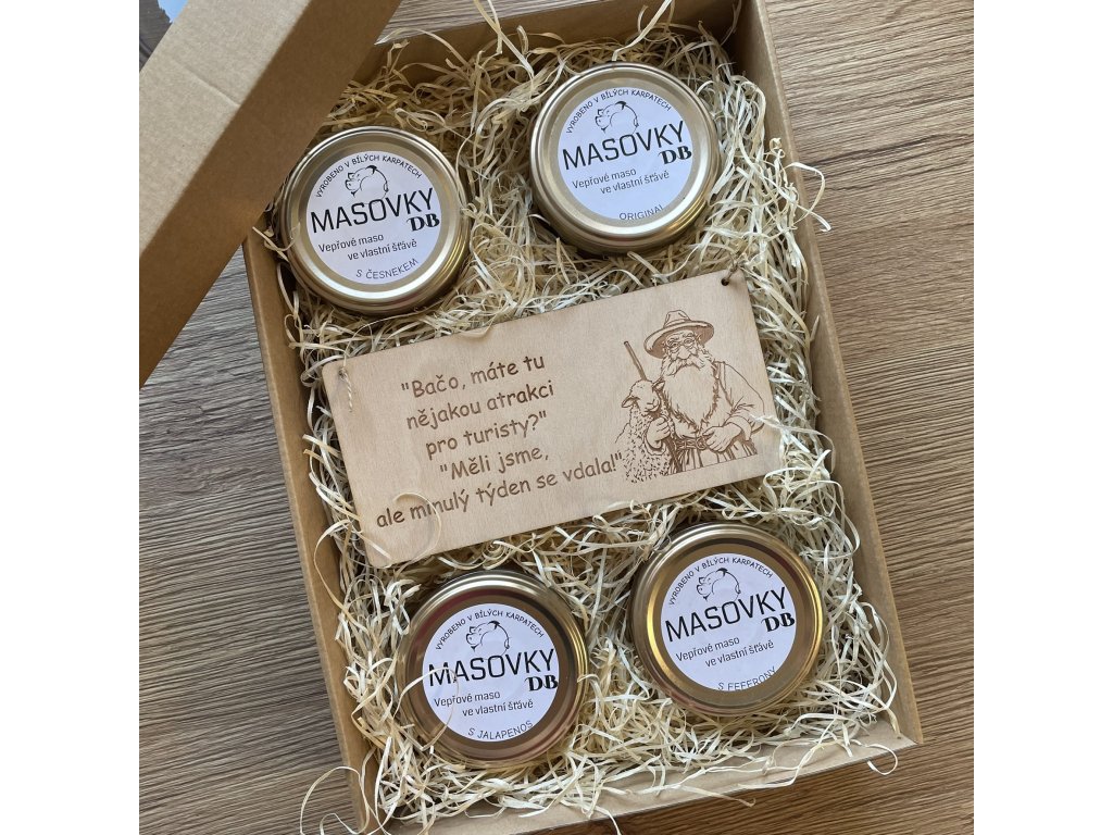 Mňamózní dárková sada se 4 masovkami a vtipnou cedulkou pro muže - 2 varianty