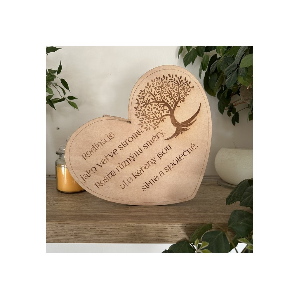 Dřevěné srdce o rozměru 30 cm s vygravírovaným textem o rodině a stromem krásně ozdobí Váš domov nebo udělá radost Vašim blízkým.