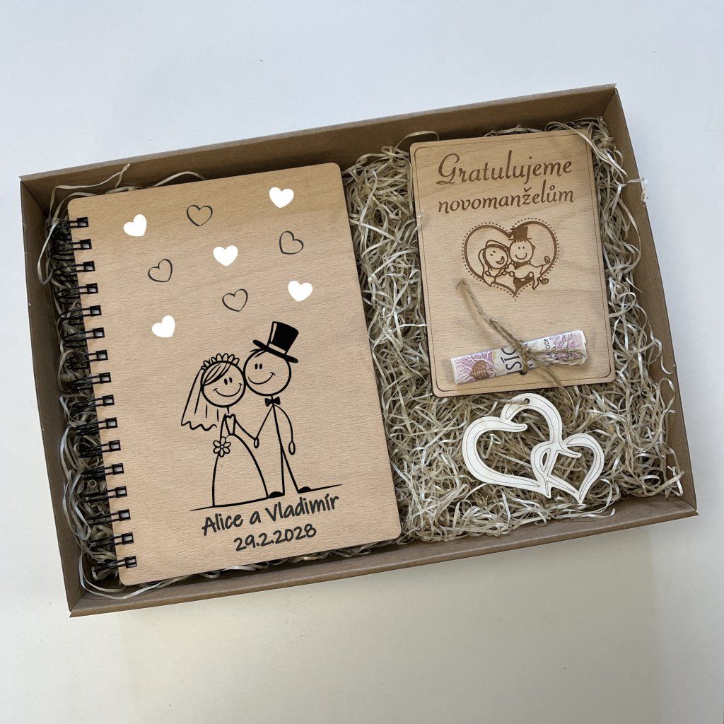 Udělejte radost novomanželům svatebním balíčkem, který obsahuje svatební přání na bankovky, dřevěný zápisník se jmény novomanželů a datumem svatby. Vše je dárkově zabaleno v papírové krabičce s průhledným víkem, stačí jen darovat. Díky personalizace udělá zápisník osobní dojem.