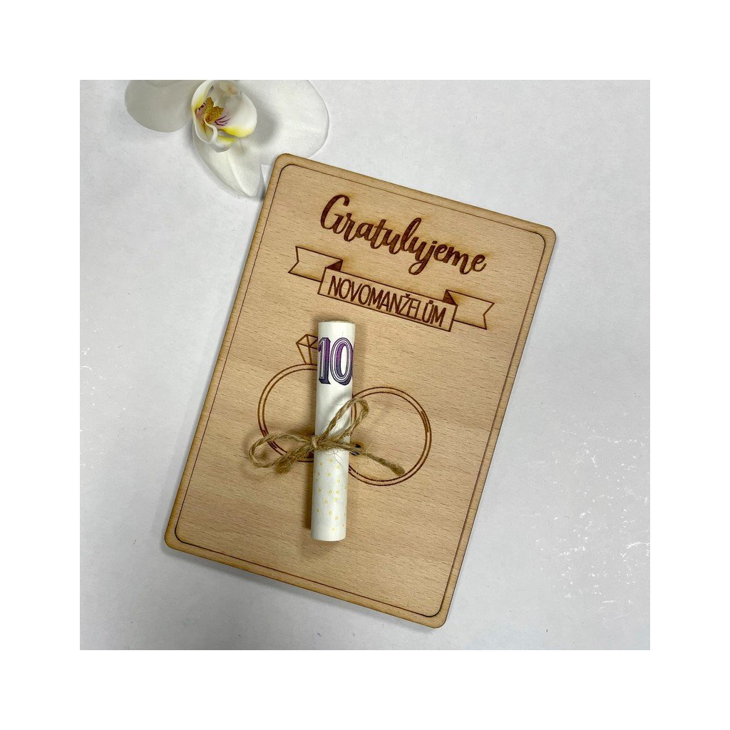 Chcete věnovat bankovky novomanželům originálně? Vyberte si z našich dřevěných přáníček.