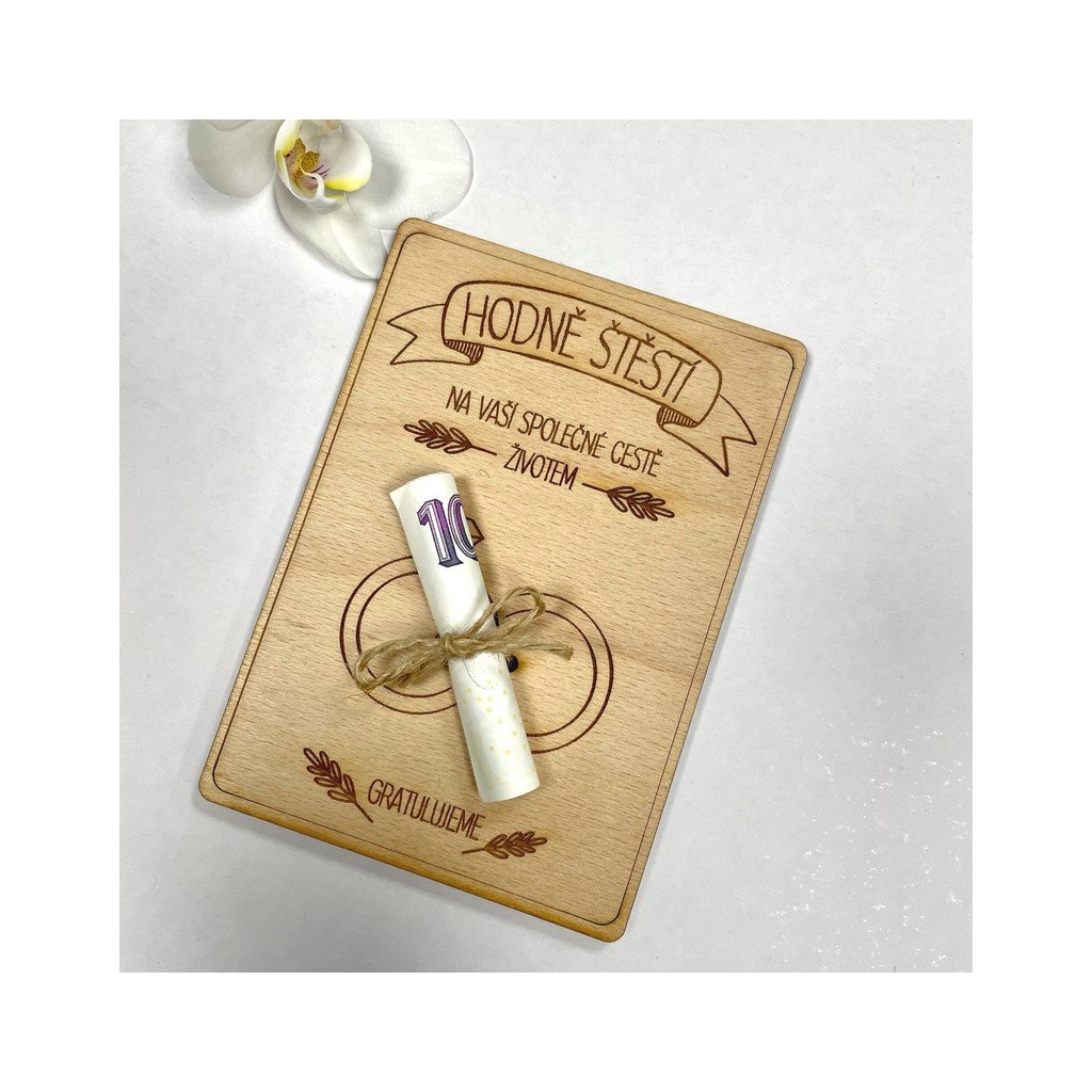 Chcete věnovat bankovky novomanželům originálně? Vyberte si z našich dřevěných přání na peníze se svatebním motivem.
