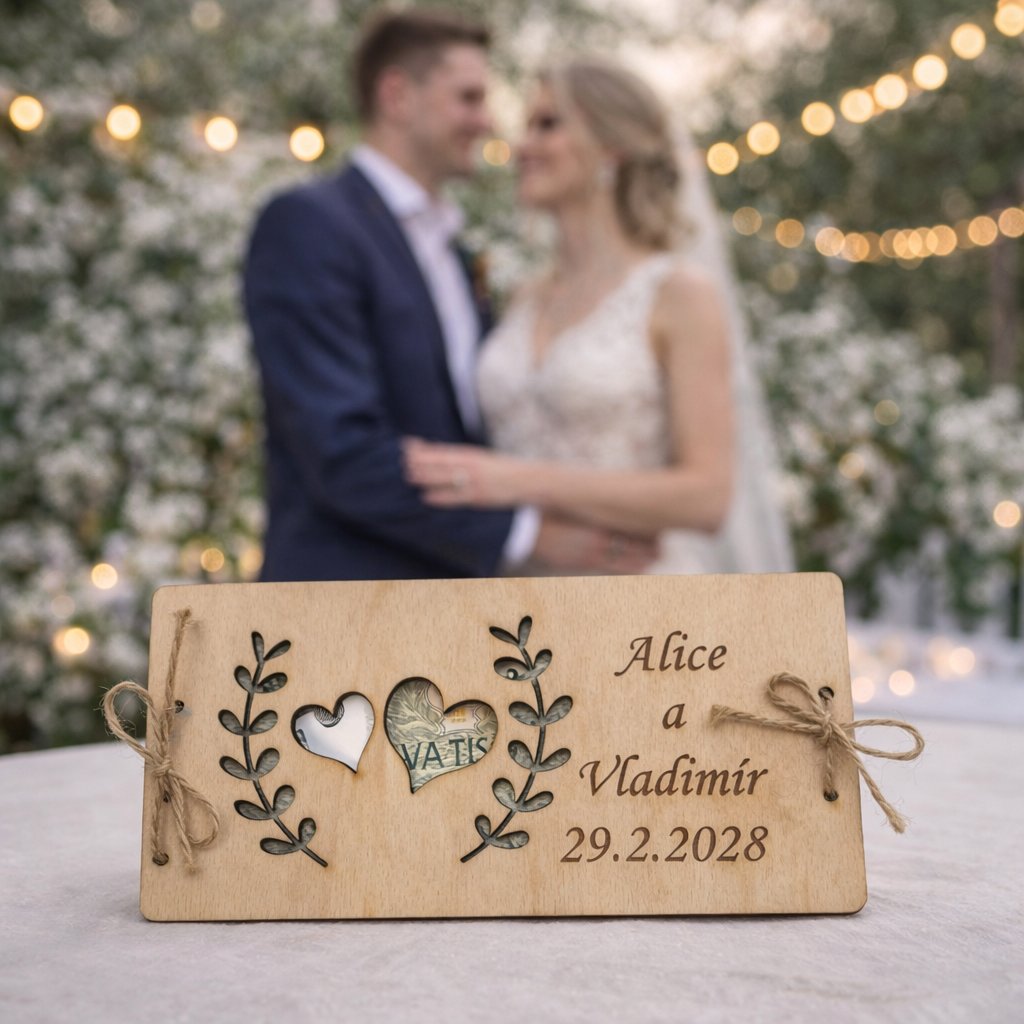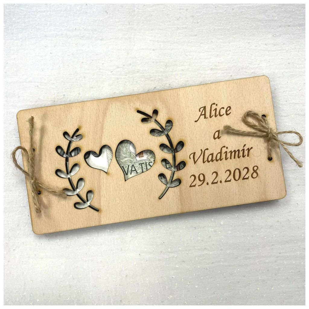 Darujte dřevěné přání, které je doplněno jejich jmény a datem svatby, do kterého vložíte bankovky. Novomanželé tak budou mít krásnou památku na svůj svatební den.