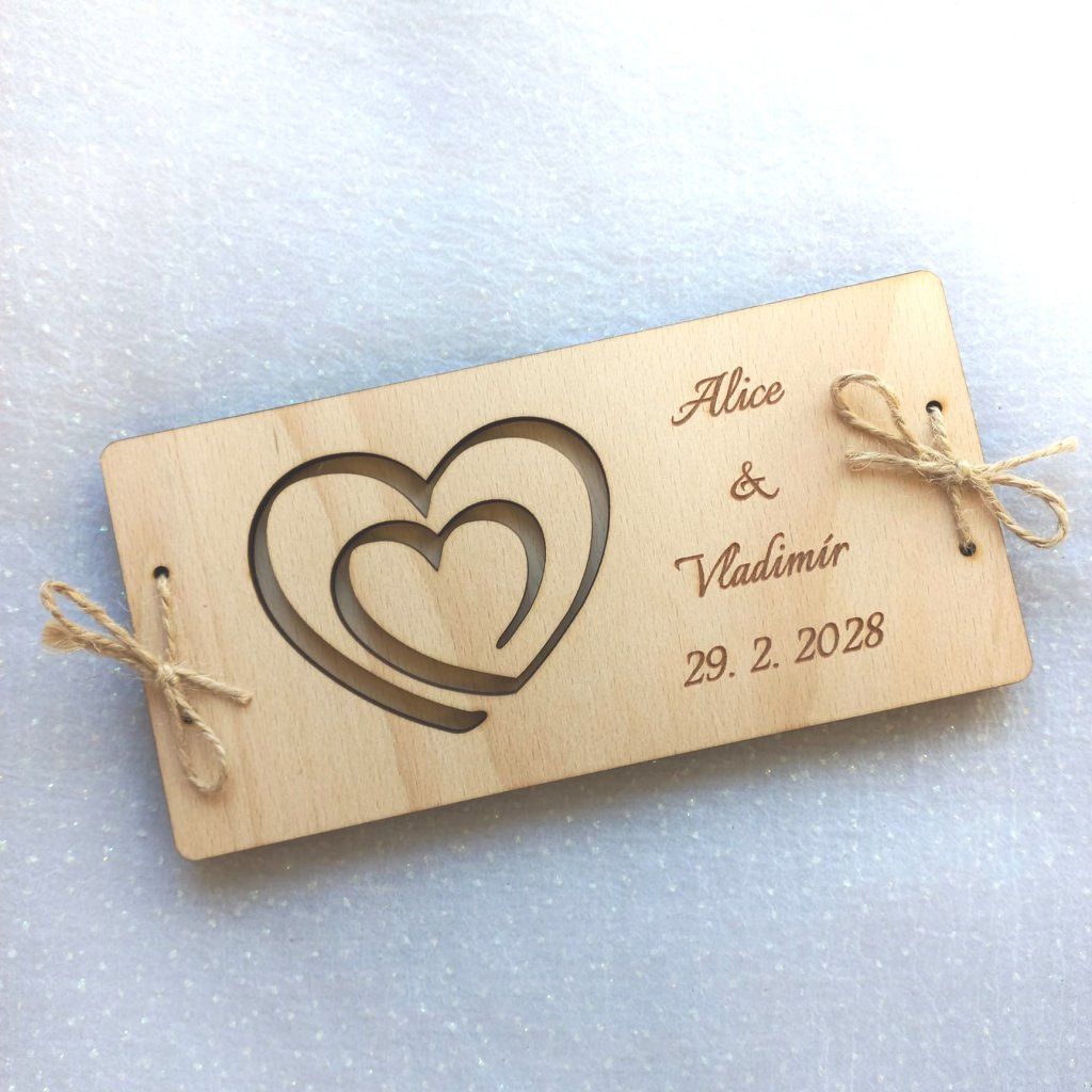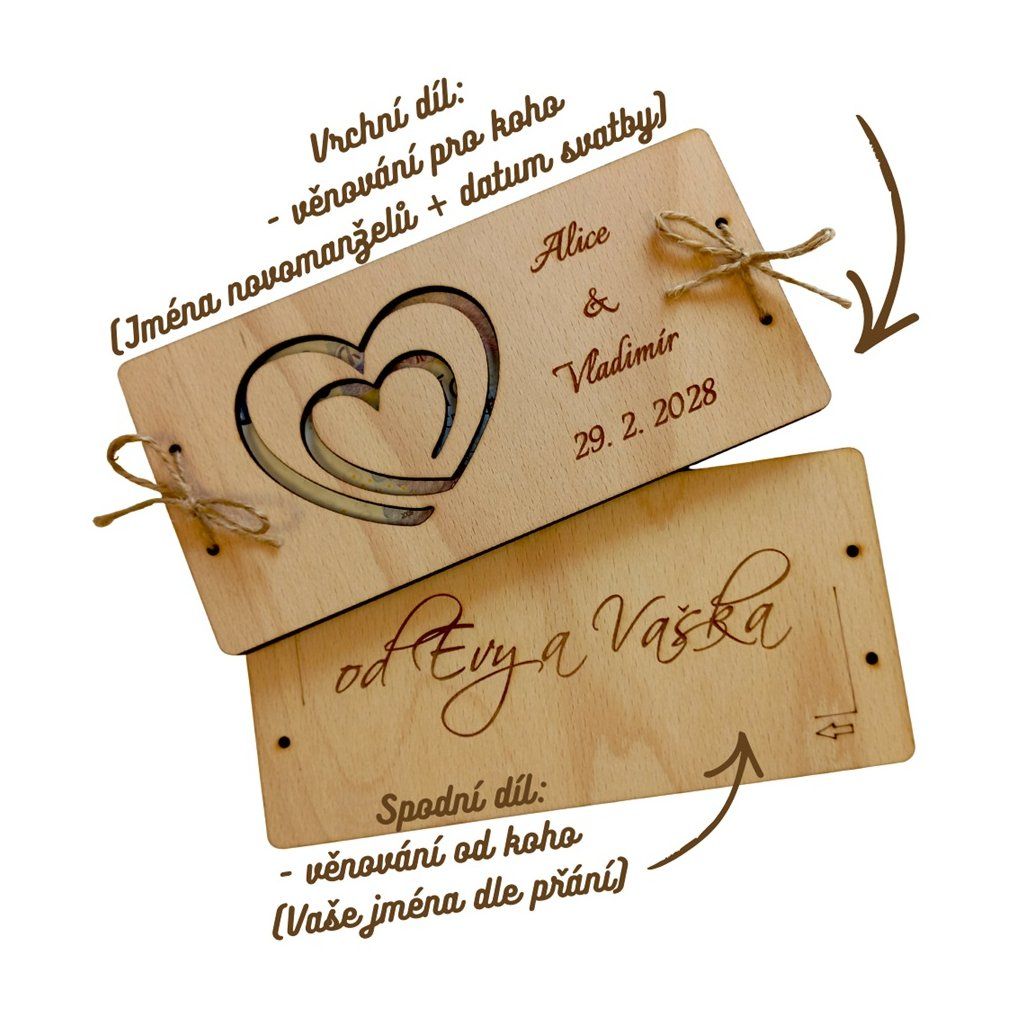 Darujte dřevěné přání, které je doplněno jejich jmény a datem svatby, do kterého vložíte bankovky. Novomanželé tak budou mít krásnou památku na svůj svatební den. Můžete zvolit i variantu, kde bude na spodním díle (pod vloženými penězi) napsáno věnování, od koho přání je.