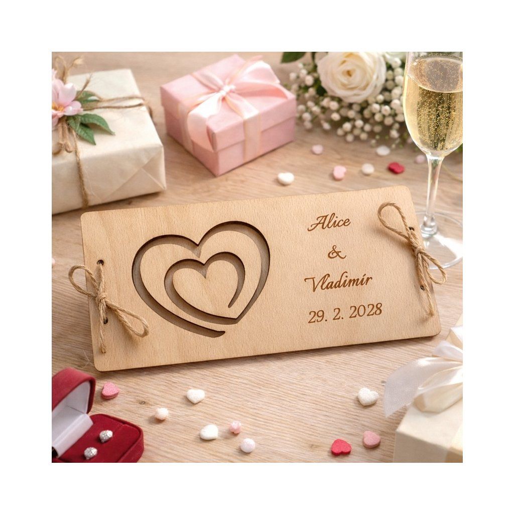 Darujte dřevěné přání se zamilovaným motivem srdce, které je doplněno jmény novomanželů a datem svatby, do kterého vložíte bankovky. Novomanželé tak budou mít krásnou památku na svůj svatební den.