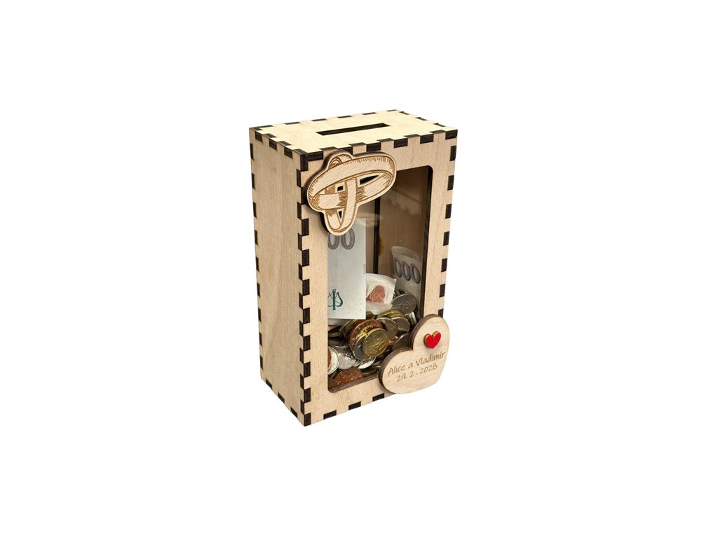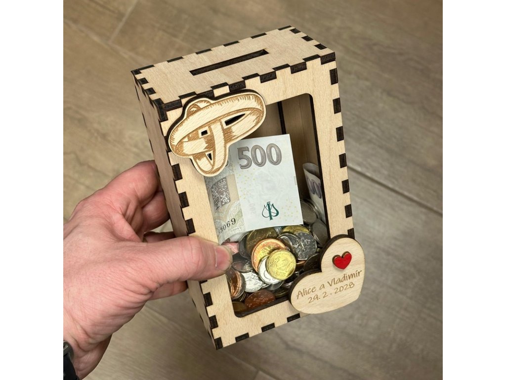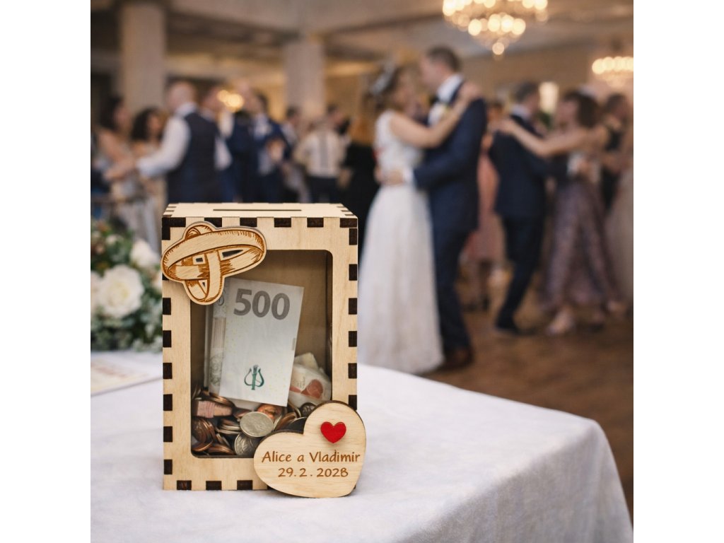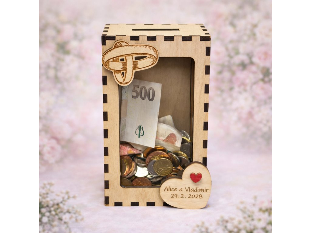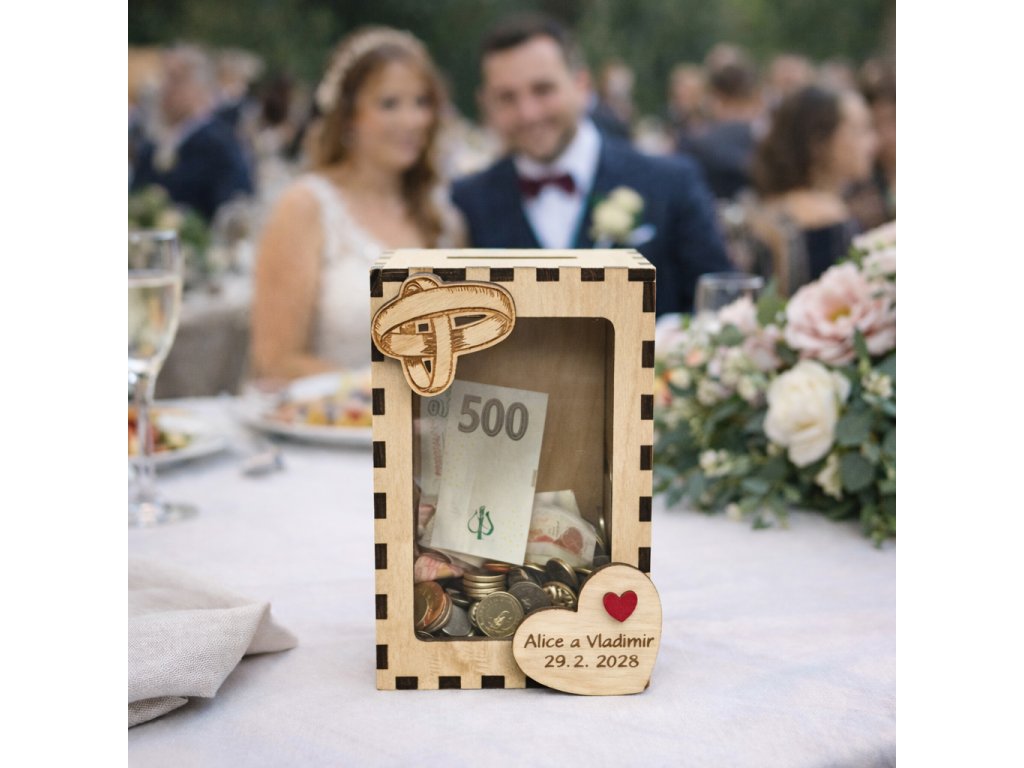 Pokladnička má svatební design, lze ji personalizovat na míru přidáním jména a datumem svatby. Novomanželům tak zůstane krásná vzpomínky na jejich velký den a vzpomínka na celý život.