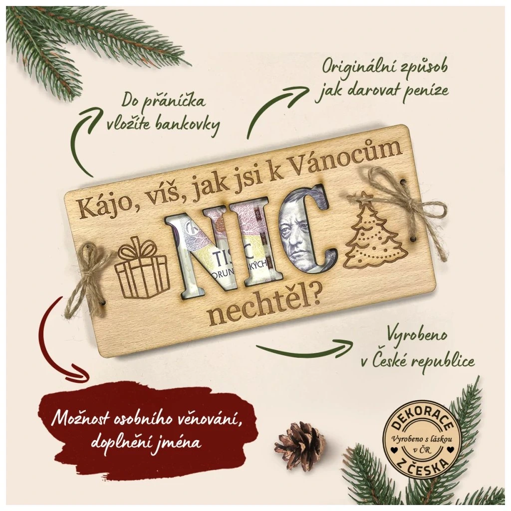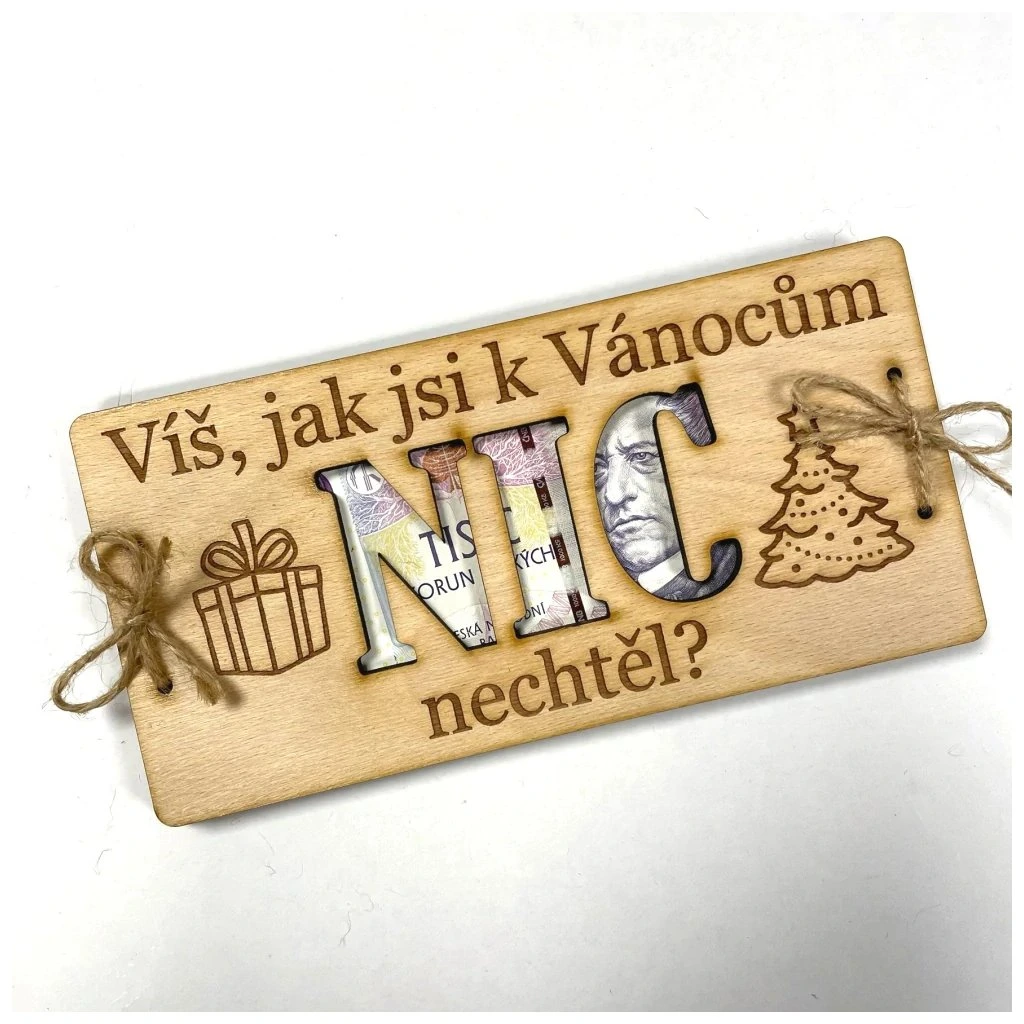 Originální vánoční dřevěné přání na bankovky s nápisem NIC v mnoha variantách. Vyberte si tu svoji dle přání a oživte přání vlastním věnováním.