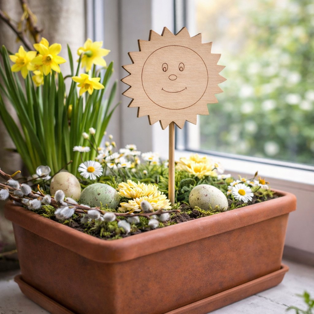 Dřevěné sluníčko na zápichu, které může být nejen krásnou jarní dekorací, ale také vhodnou dekorací interiéru po celý rok.
